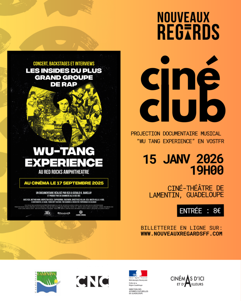 Le jeudi 15 janvier 2026 à 19h, le Ciné Théâtre de Lamentin accueille la projection de Wu Tang Experience, un documentaire musical rare qui capture un moment historique : la rencontre du Wu-Tang Clan avec un orchestre symphonique, dans le décor spectaculaire du Red Rocks Amphitheatre, au Colorado.