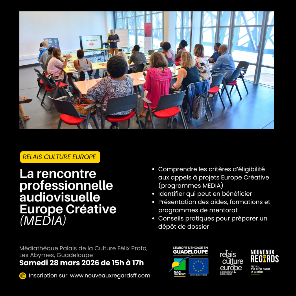 Pensée pour les professionnel·le·s du cinéma et de l’audiovisuel de Guadeloupe et des Antilles françaises, cette rencontre vise à mieux faire connaître les opportunités offertes par le volet MEDIA du programme Europe Créative, à accompagner la structuration des projets et à encourager le développement de coopérations à l’échelle européenne.